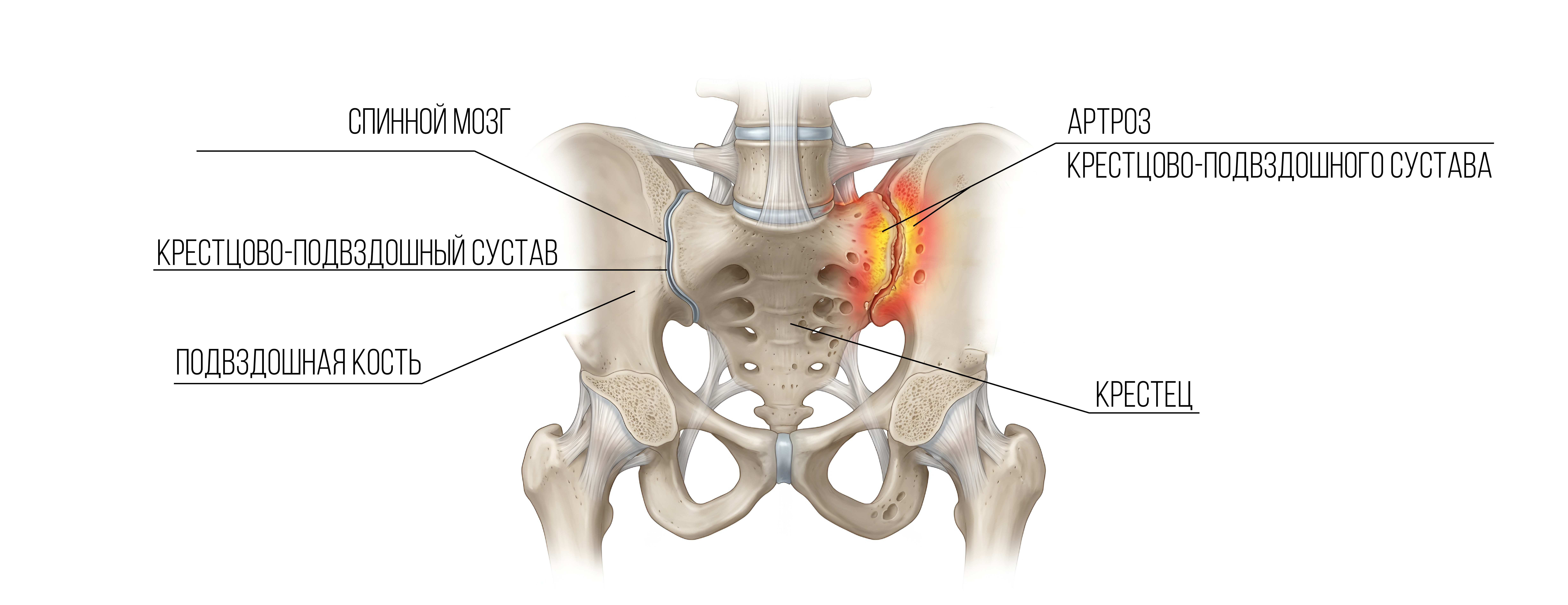 Артроз крестцово-подвздошного сустава — это износ сустава, соединяющего позвоночник и таз. Он может вызывать хроническую боль в нижней части спины, ягодице или паху, особенно при движении и нагрузке. Это хроническое заболевание, при котором разрушается суставной хрящ и меняются окружающие ткани.